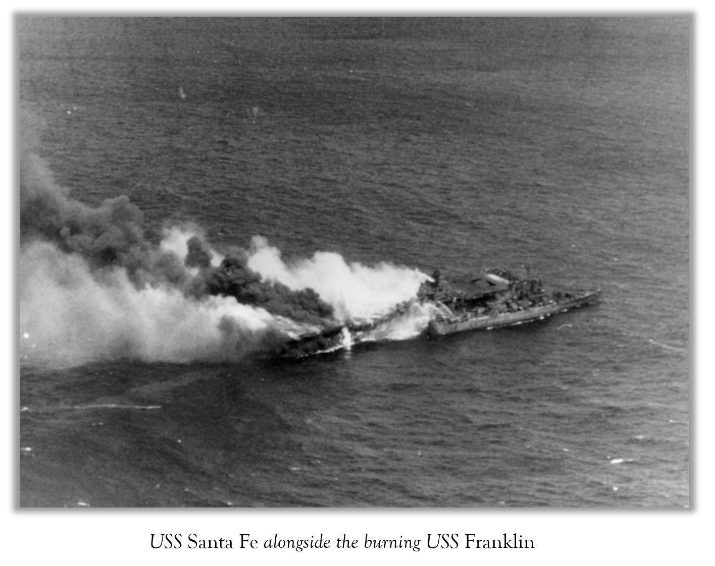 A light cruiser, USS Santa Fe came alongside Franklin, despite the ongoing explosions. The gangway between the two ships “was like a highway and it was very, very busy,” one eyewitness said.