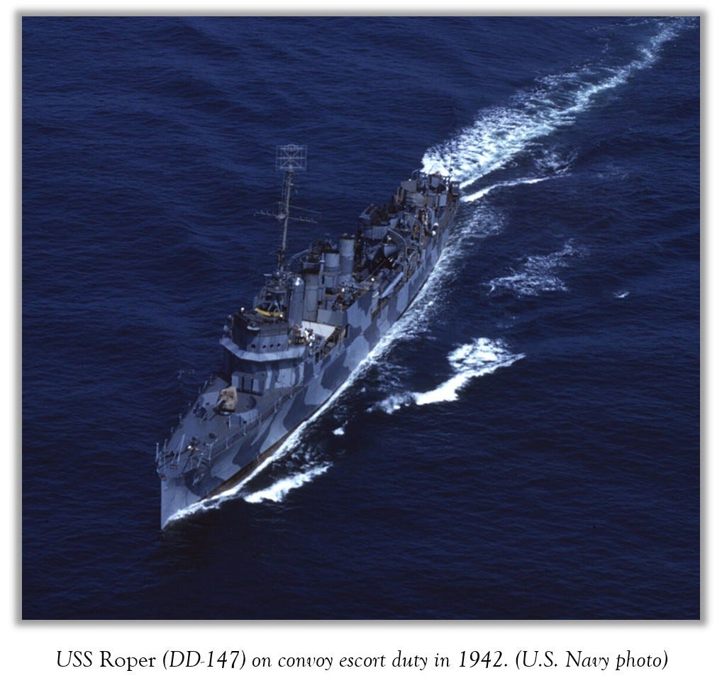 U-boats were then a constant threat, and Roper was among those patrolling the waters along America’s eastern coast. Her crew had not yet spotted any German submarines.